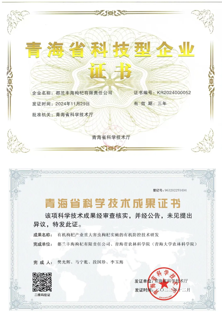 沃山农积极研发专利技术,如“有机枸杞产业重大害虫枸杞实蝇的有机防控技术研发”。这一技术不仅有效解决了枸杞种植中的害虫问题,还确保了整个种植过程的有机和环保,为有机枸杞的高品质提供了有力保障。